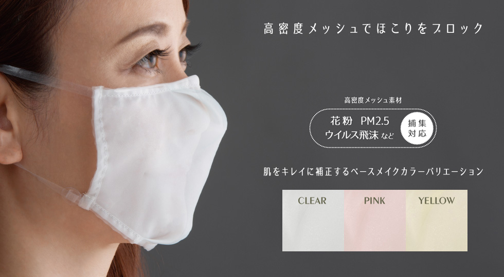全く新しい透けるメッシュ素材、光沢感がありメイクをしたような風合いのマスクで、口元をキレイに見せることができます。
